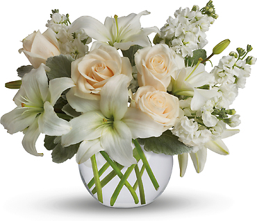 Like a vacation for the senses, this lovely bouquet delivers an oasis of beauty and elegance. Soothing, serene and very special. Crème roses, white asiatic lilies and stock stem are incredibly arranged in a bubble vase. When it comes to bouquets, this is definitely the right way to do white. (vase/baskets/accessories may vary upon availability) (5bb)